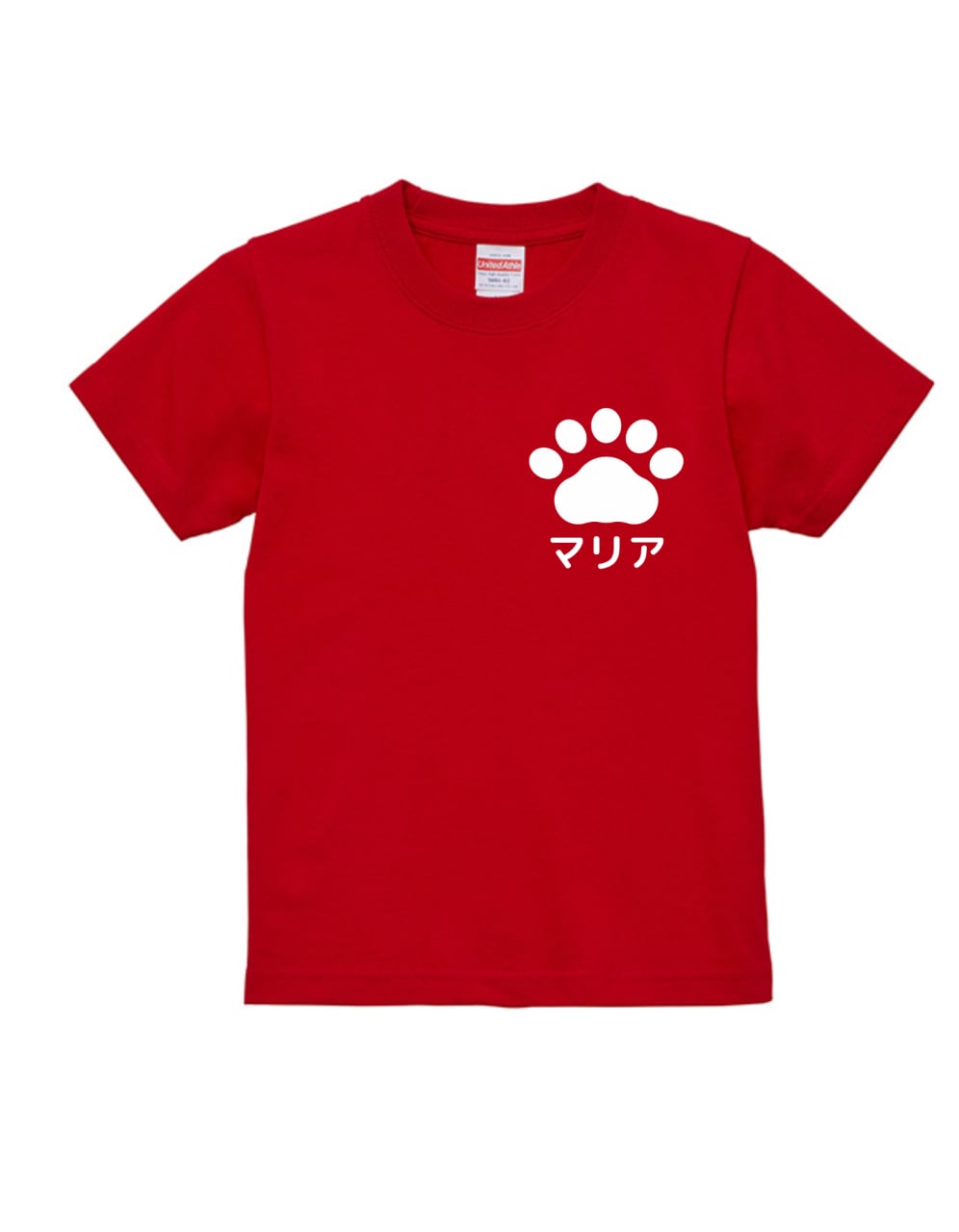 トレンドの肉球デザインとお子様の名入れが融合した、おしゃれで個性的な一枚。特別な日や普段使いにもぴったりです。ぜひ、お子様に喜んでもらえる、オリジナルTシャツをプレゼントしてください。